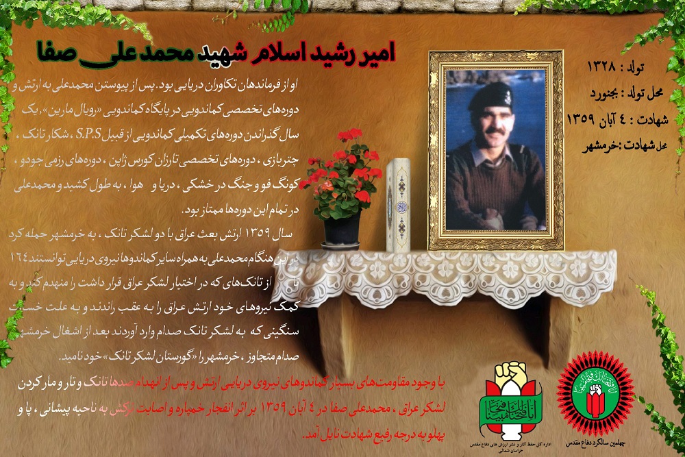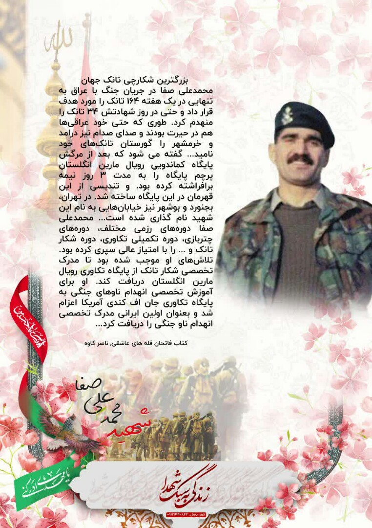 محمدعلی صفا، از تکاوران گردان تکاوران دریایی بوشهر بود که در عملیاتهای مختلف سال اول جنگ حضور داشت. او که یکی از نوابغ تکاوری دنیا بود، دورههای تکاوری و شکار تانک را با امتیاز عالی سپری کرد. تلاشهای او موجب شد عنوان و مدرک متخصص شکار تانک را از پایگاه کماندویی «رویال مارین» دریافت کند. شهید صفا در روزهای هجوم ارتش بعث به خرمشهر، رشادت فراوانی از خود نشان داد و با هنر و شجاعت خود، خرمشهر را به گورستان تانکهای عراقی تبدیل کرد. محمدعلی صفا در ۴ آبان ماه ۱۳۵۹ بر اثر اصابت ترکش به شهادت رسید.